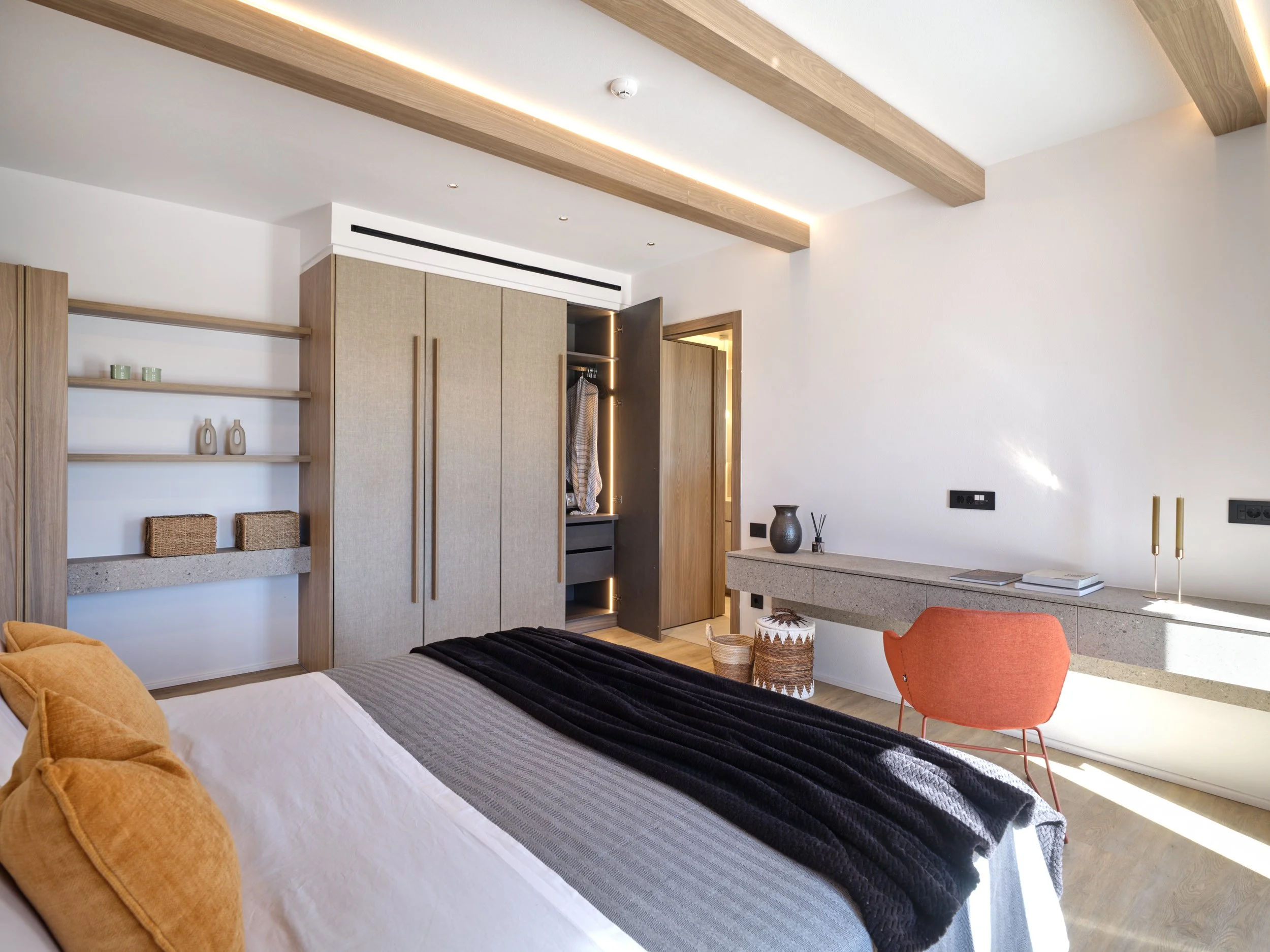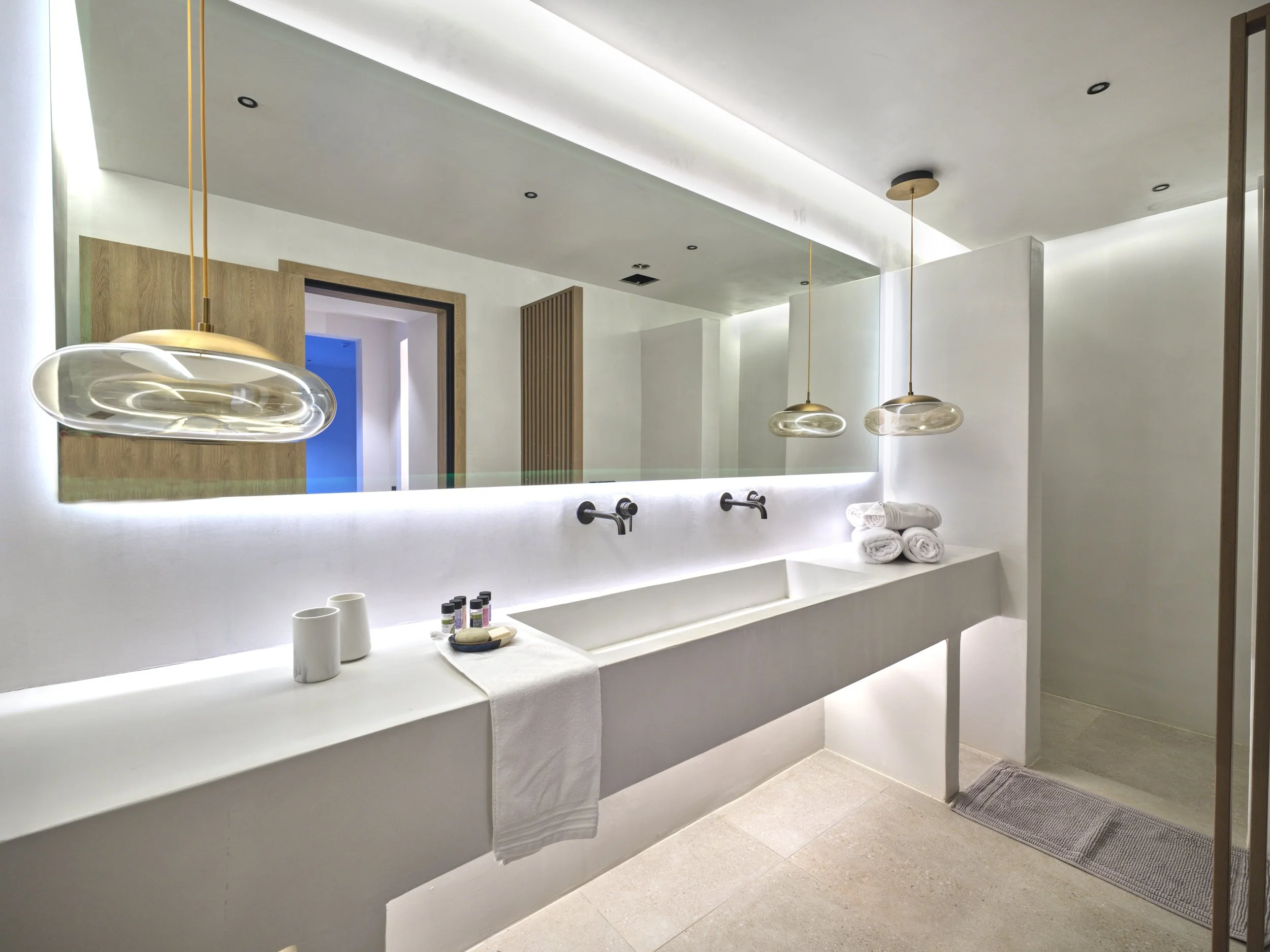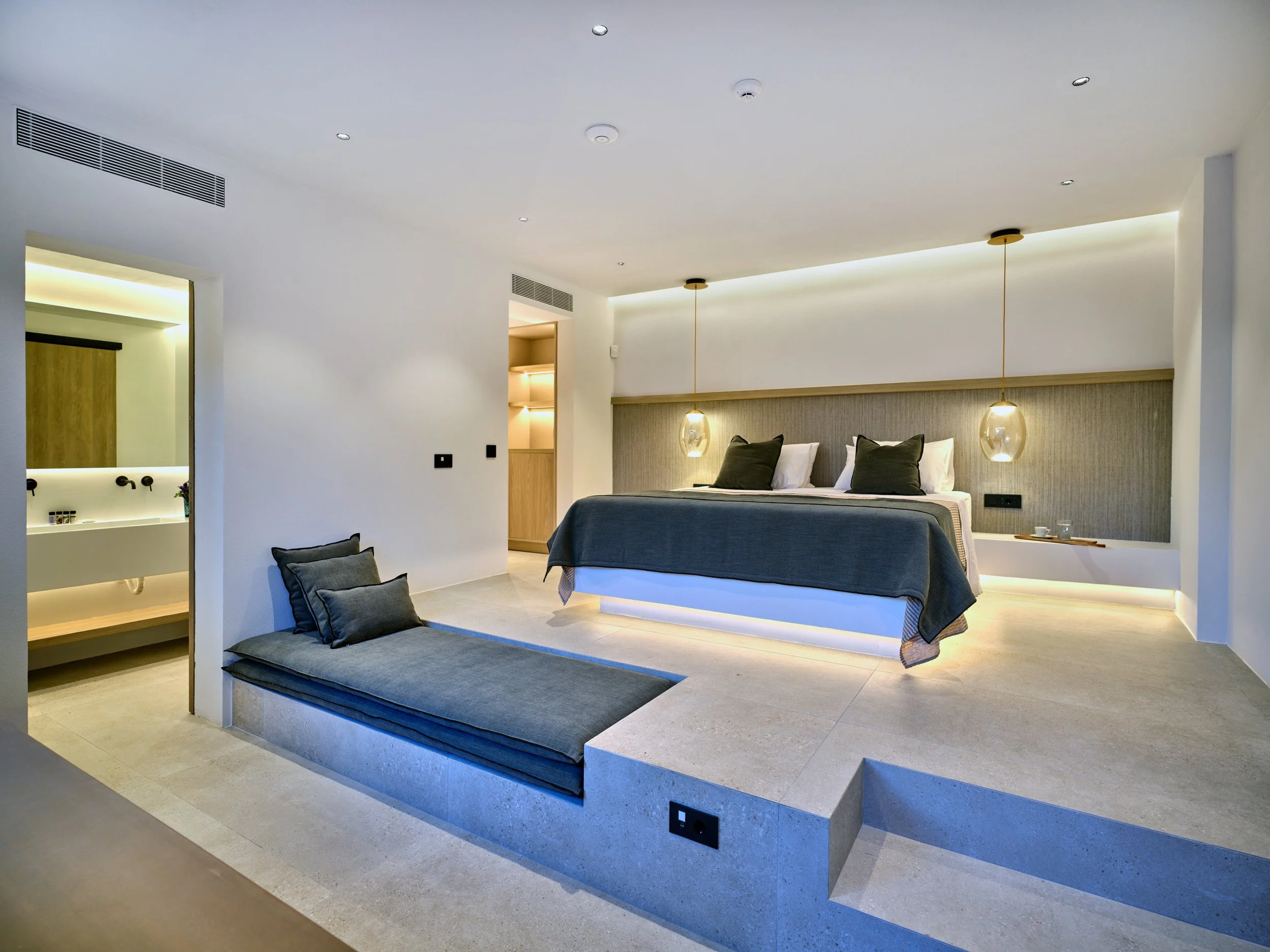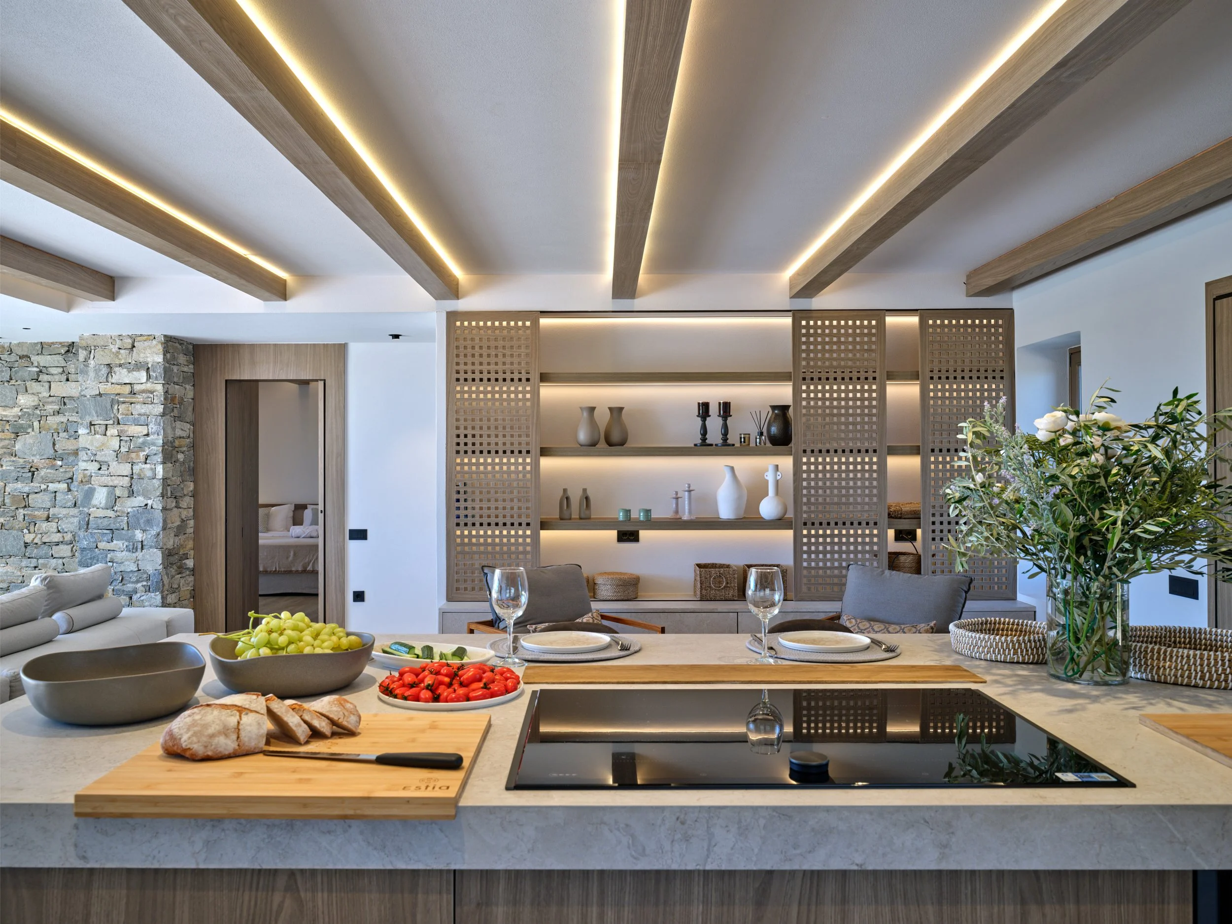 Generous indoor and outdoor living areas are centred around a large swimming pool with an integrated firepit, creating an inviting atmosphere from day to night. Outdoor dining areas, a bar, and multiple lounge spaces make Villa Luna ideal for entertaining, while wellness facilities include a fully equipped private gym and a two-person Sunlighten infrared sauna, delivering a refined, resort-style living experience in total privacy.